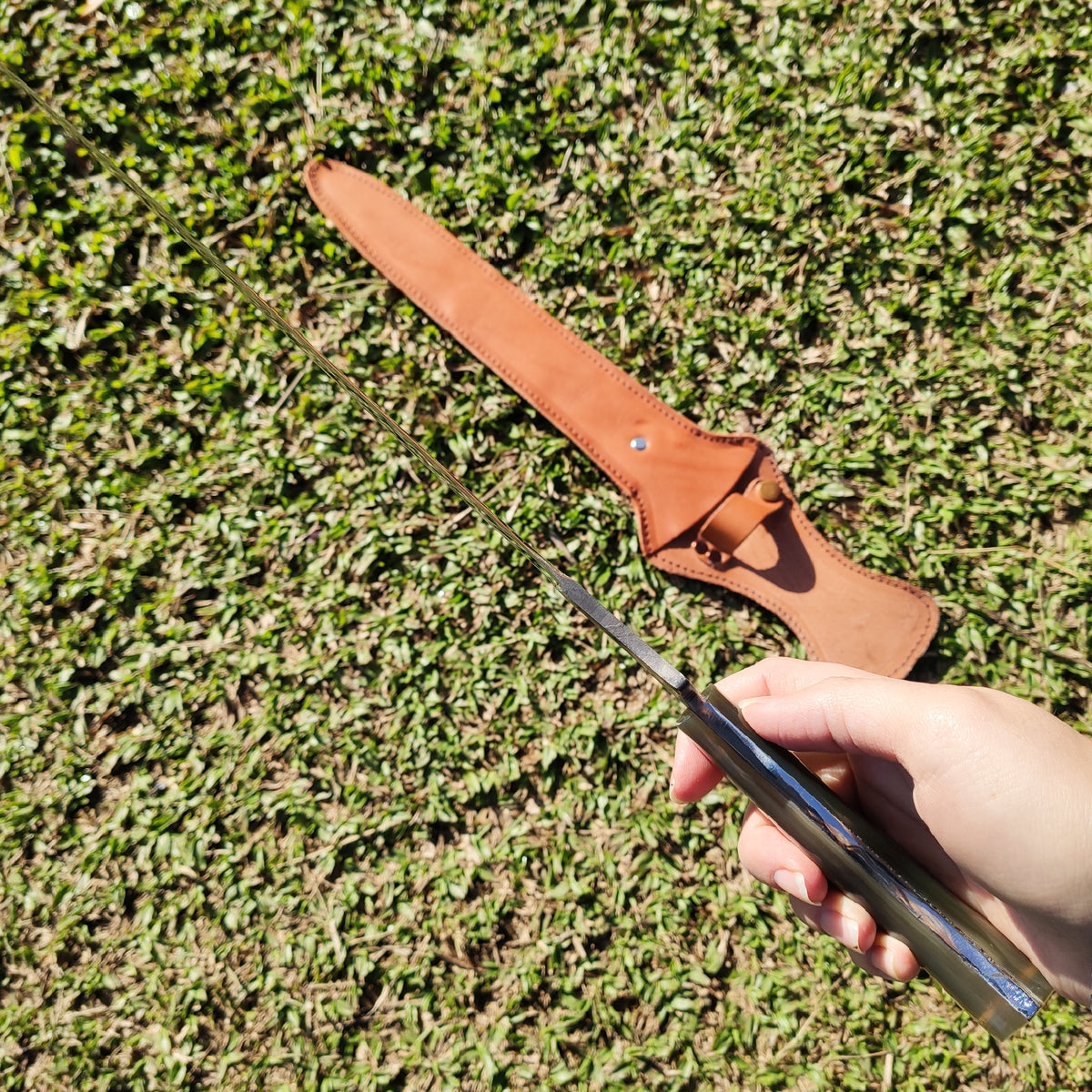 Adaga 5mm produzida em aço inox 420c, com acabamento brut forge e lâmina de 12 polegadas com dois gumes, ou seja, possui fio em ambos os lados da lâmina, seu cabo em chifre natural torna cada peça única e exclusiva. O punhal é usado para caçar javalis ou também para aumentar sua coleção de peças exclusivas.