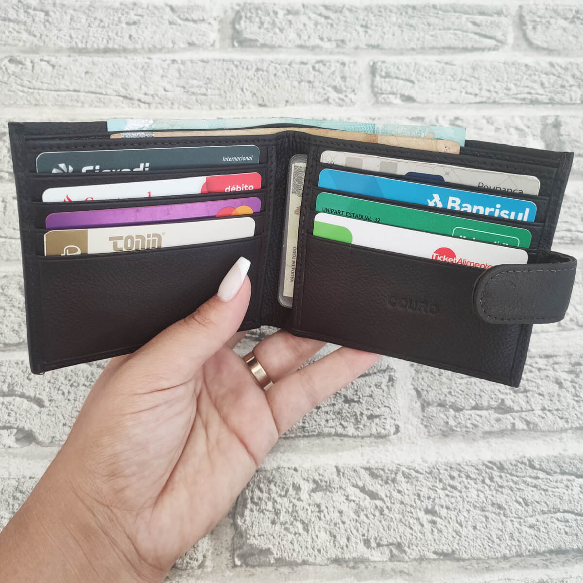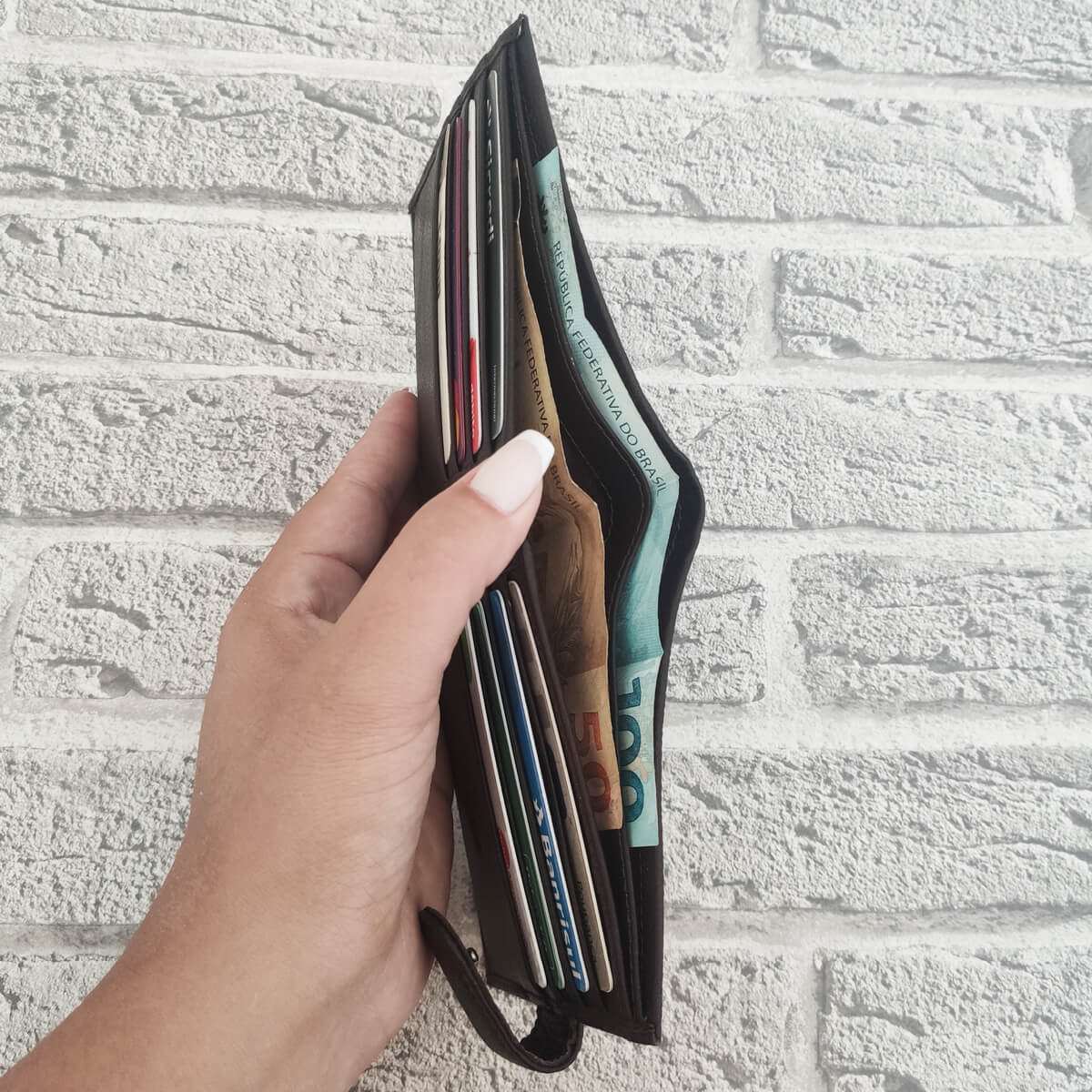 Divisórias: 8 espaços para cartões de crédito, 2 bolsos internos, porta notas com divisória. O RG cabe apenas no compartimento de notas.