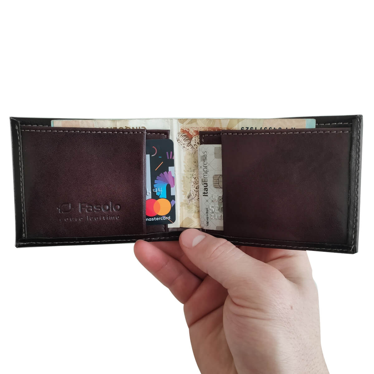- Não possui espaço para RG e CNH, os mesmos podem ser alocados no compartimentos de notas.
