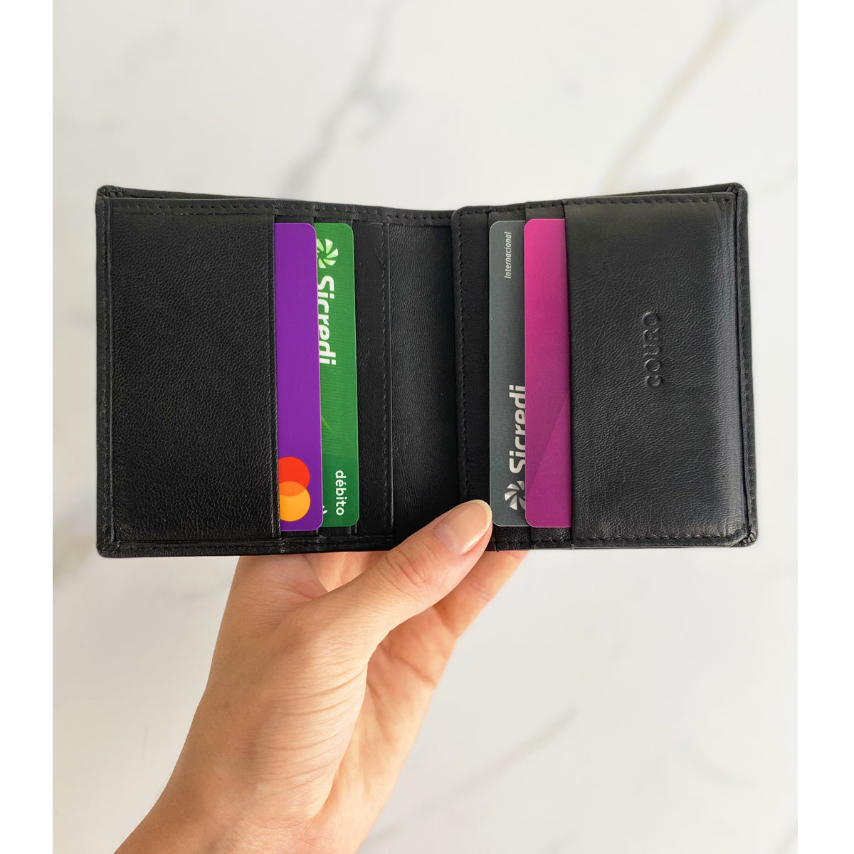 - Não possui compartimento para RG, o documento pode ser guardado nos compartimentos de notas podendo ficar um pouco dobrado;