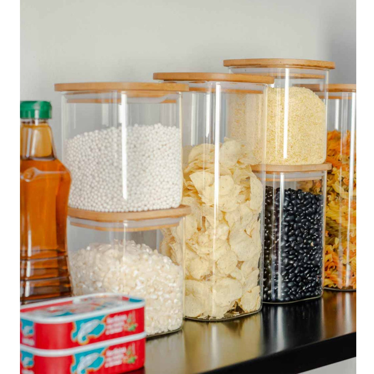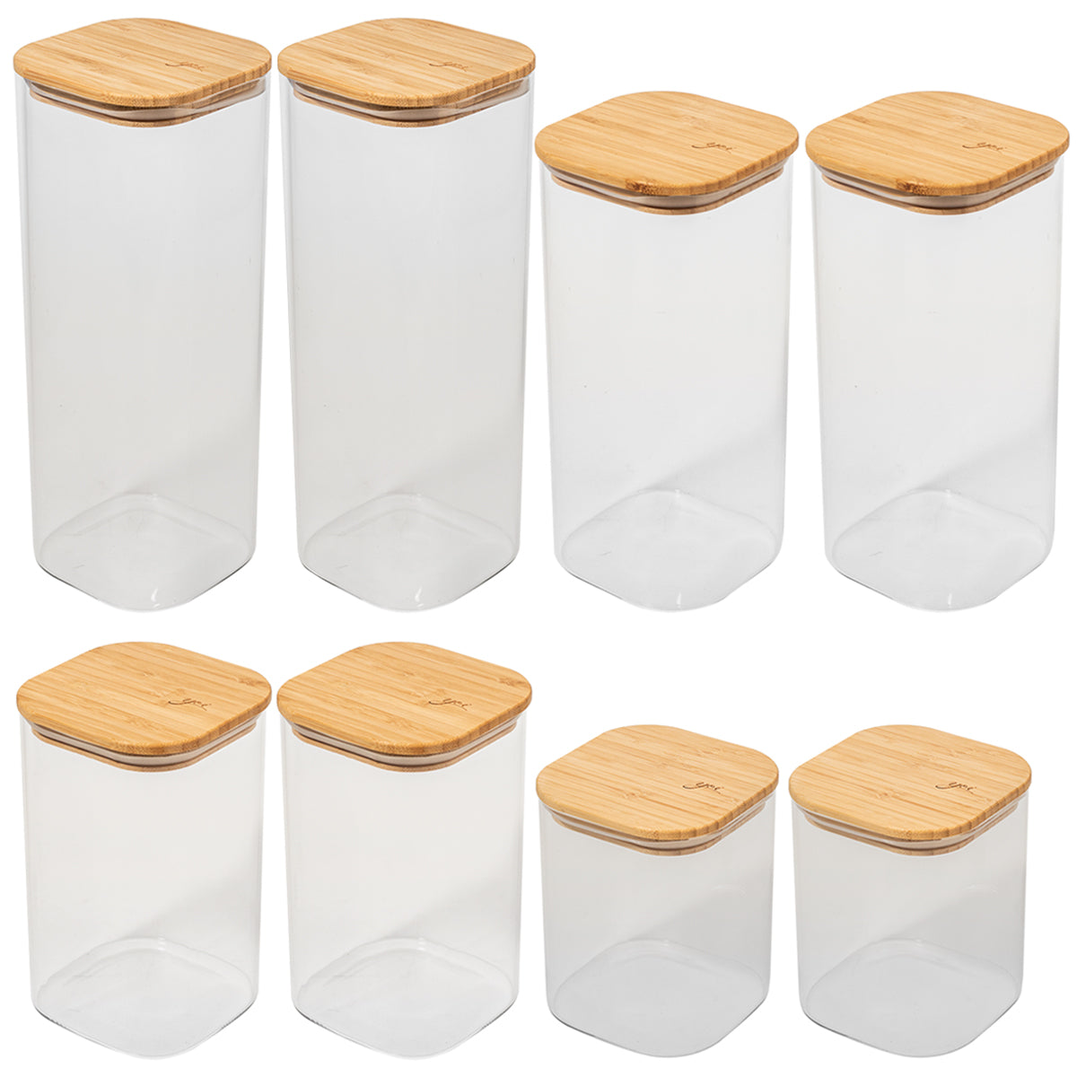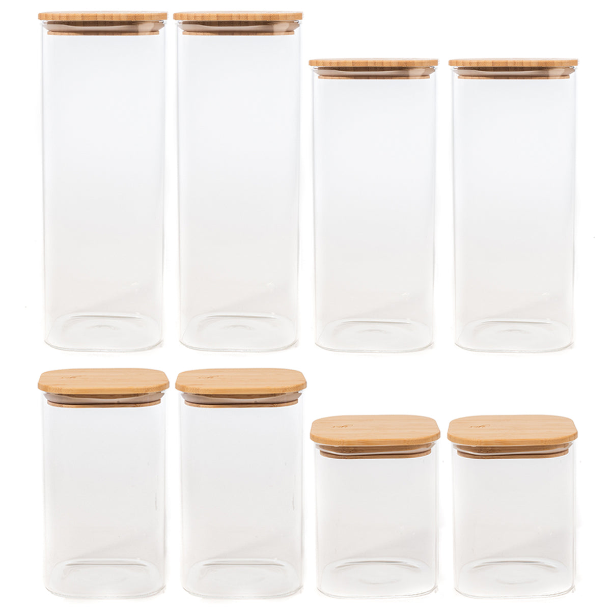 Conjunto 8 Potes Herméticos De Vidro Com Tampas Em Bambu Porta Mantimentos Quadrados Cozinha Yoi.