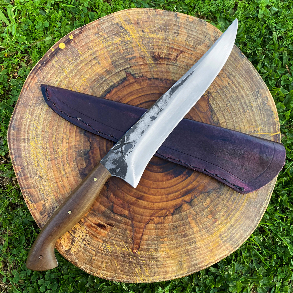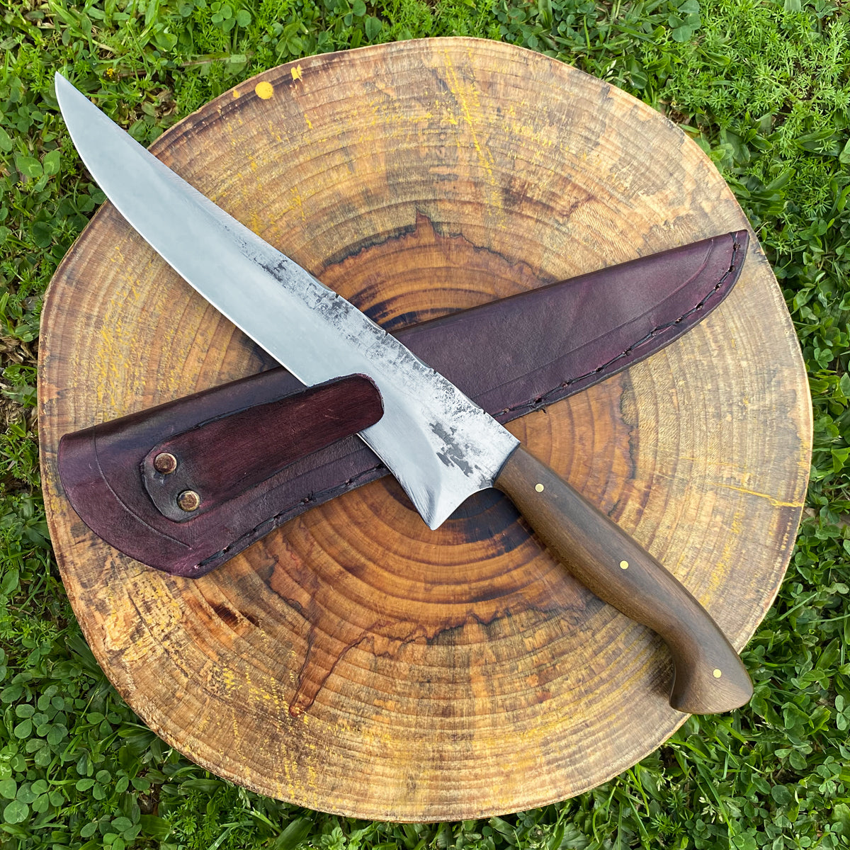 Faca Churrasco 9" Lâmina Full Tang Aço Carbono 1070 3mm Cabo Madeira com Bainha de Couro.
