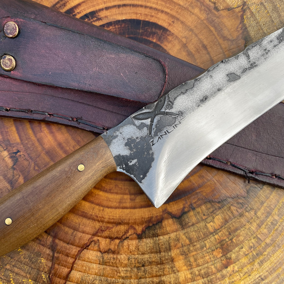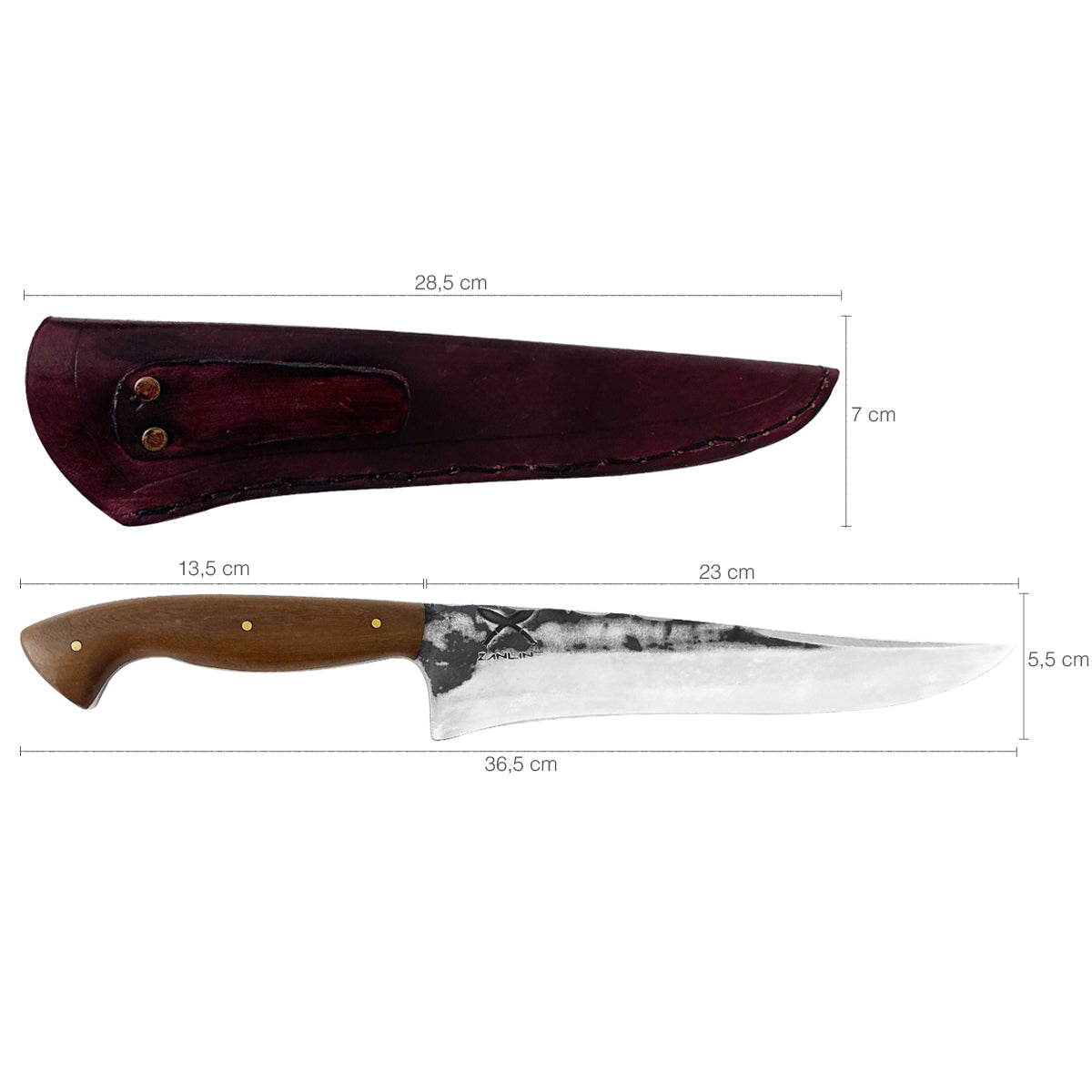 Esta faca artesanal da cutelaria Zanline é o modelo de faca mais apreciada pelos apaixonados por churrasco para o corte de um boa picanha e demais cortes de carnes. Produzida em aço carbono 5160, sua lâmina full tang de 3mm de espessura com dorso mosqueado possui acabamento robusto e resistente. Com empunhadura em madeira nobre, esta peça será única e exclusiva. Acompanha uma bainha em couro bovino.