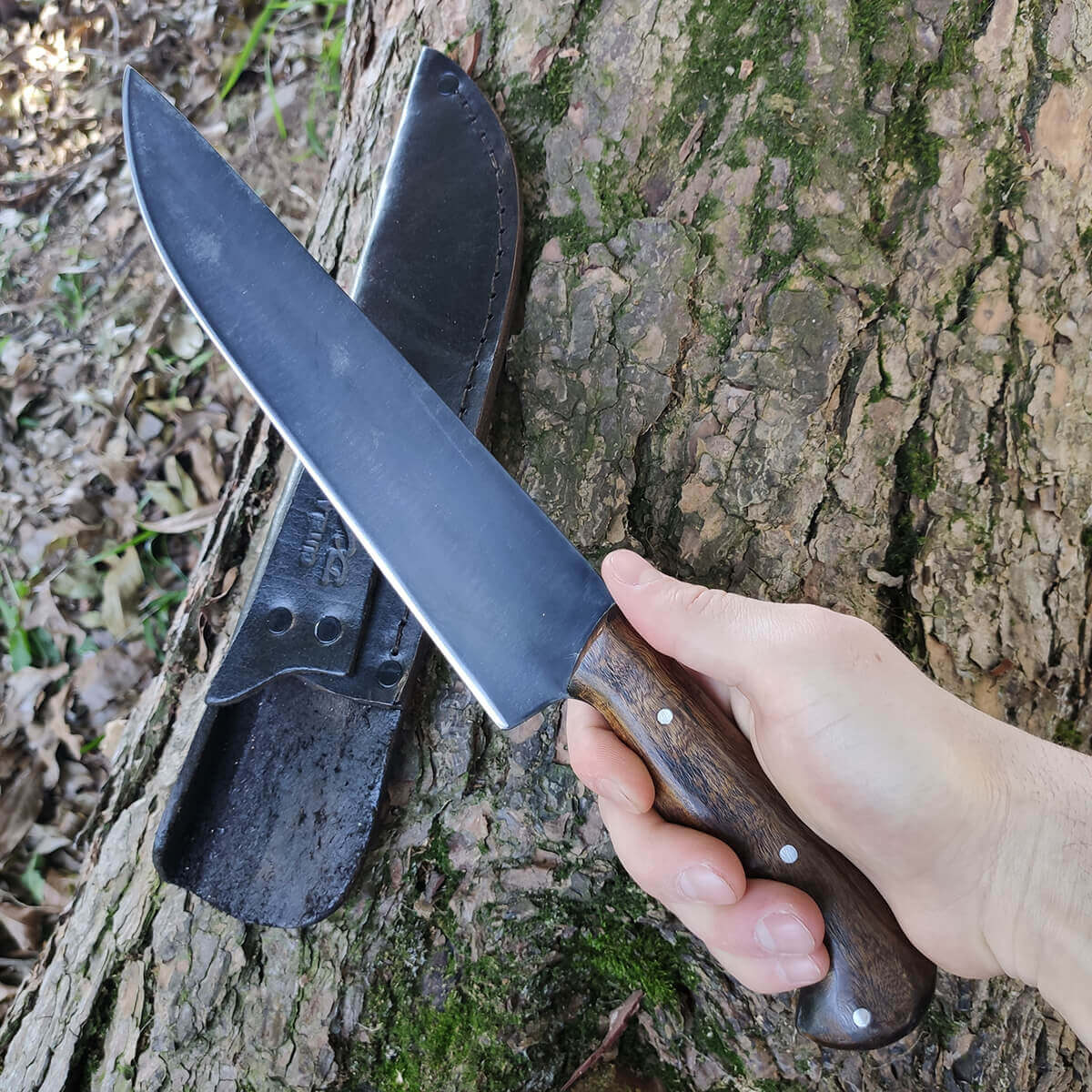 Lâmina: com tratamento térmico (têmpera) de excelente qualidade, propiciando para a faca maior resistência mecânica e durabilidade de fio. Monobloco (full tang), larga e acabamento polido.