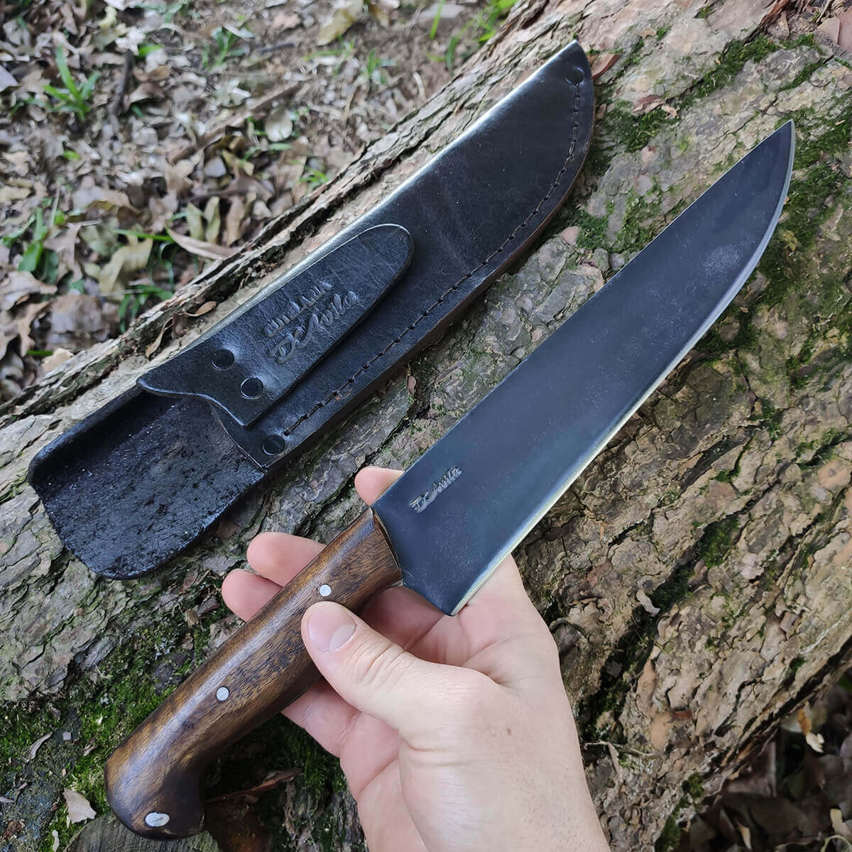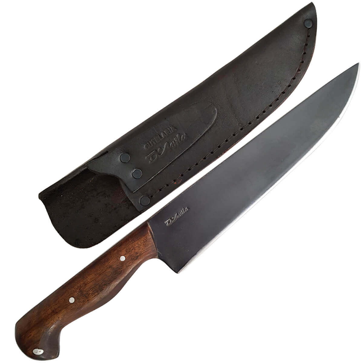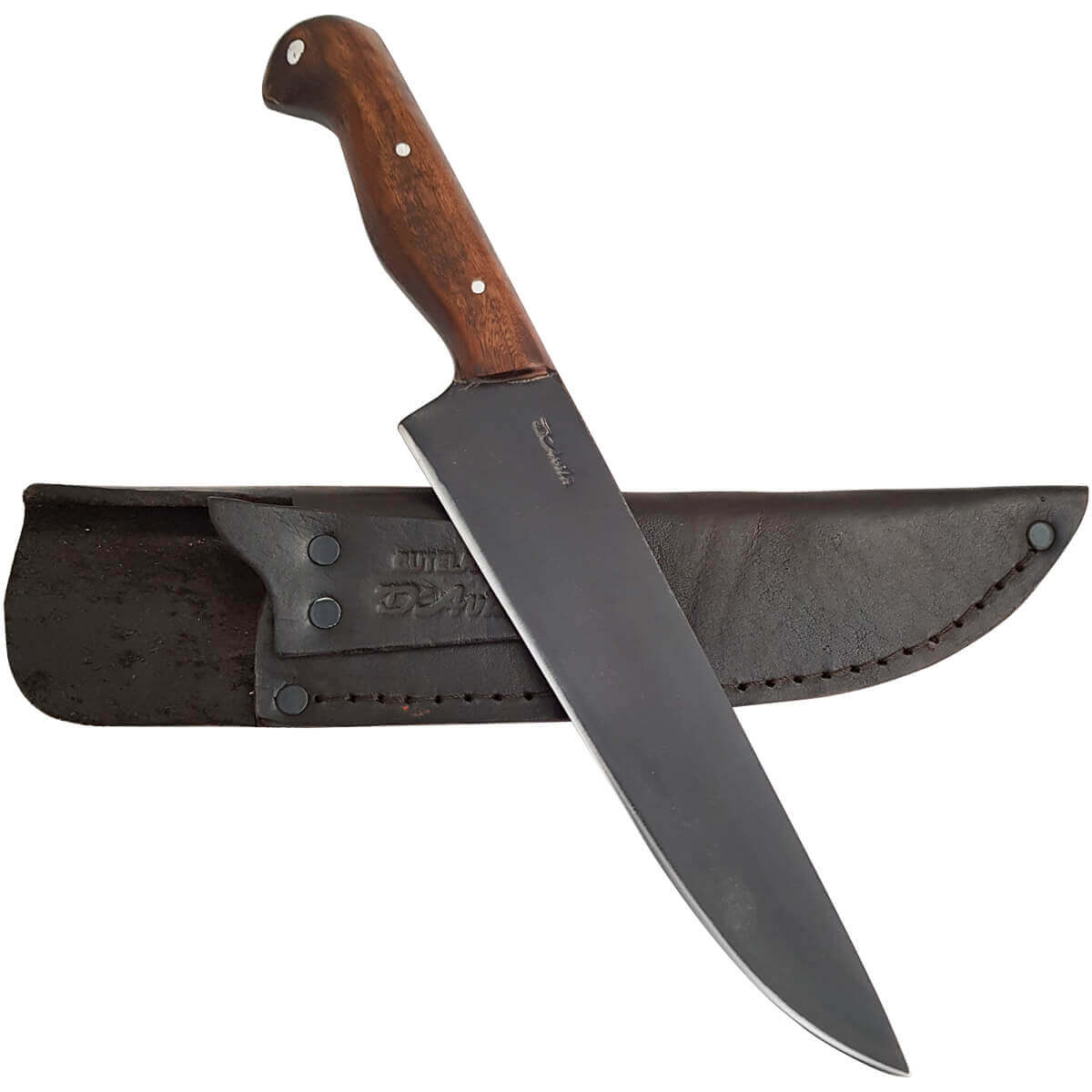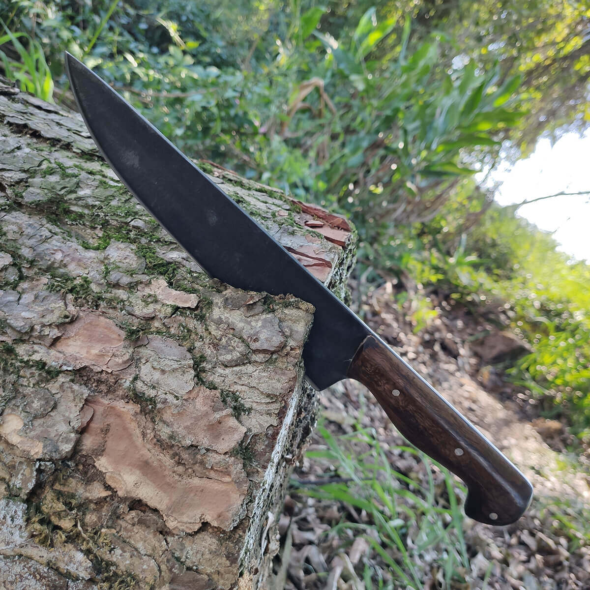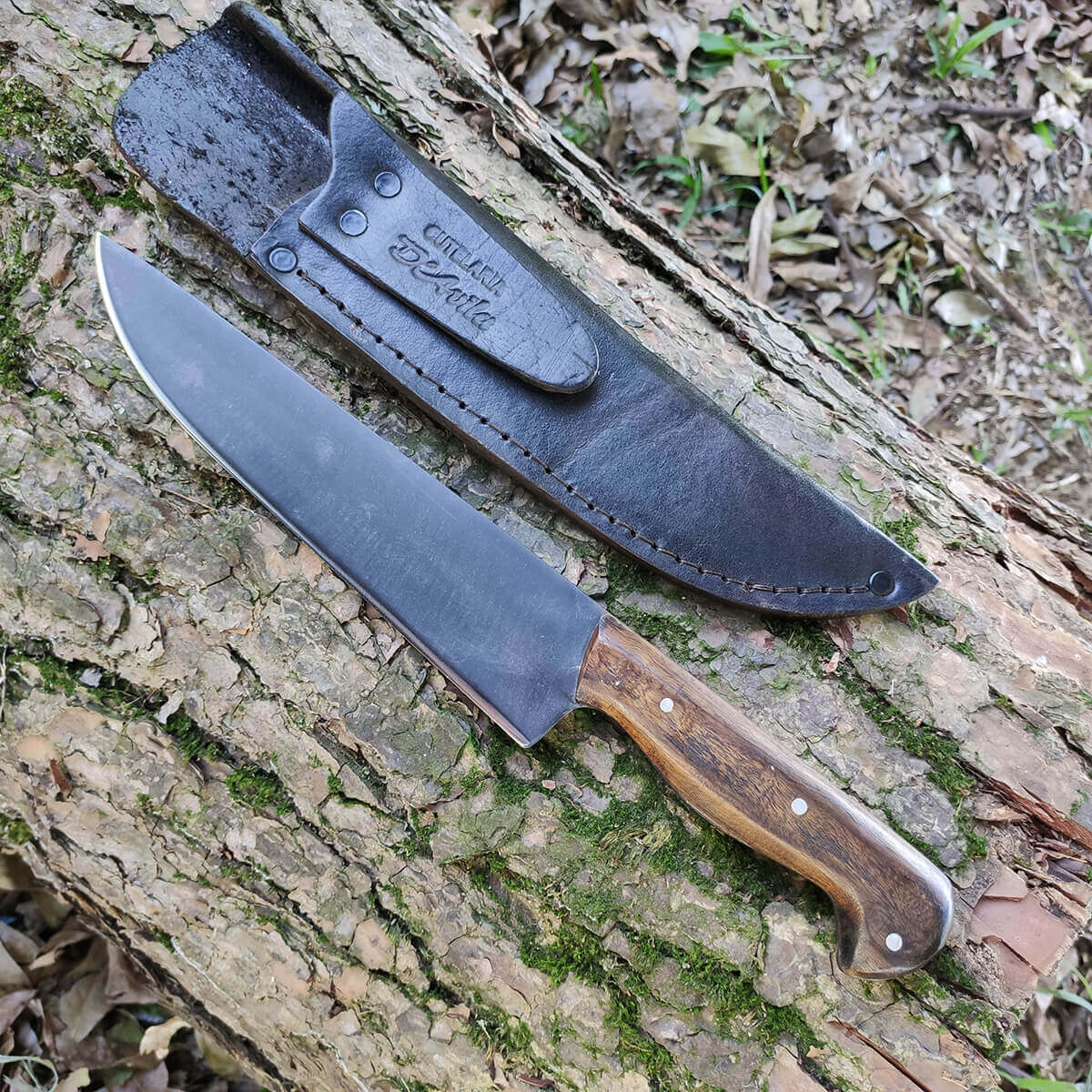 Faca picanheira artesanal, cabo D'Avila feito com madeira nobre, cada peça é única e exclusiva. Ninguém terá uma igual a sua. Com lâmina monobloco (full tang) larga em aço carbono 5160 fosfatizado a faca possui maior resistência, firmeza e excelente retenção de fio. Por passar pelo processo de fosfatização, onde a lâmina é exposta a oxidação intesa, torna-se resistente à ferrugem.