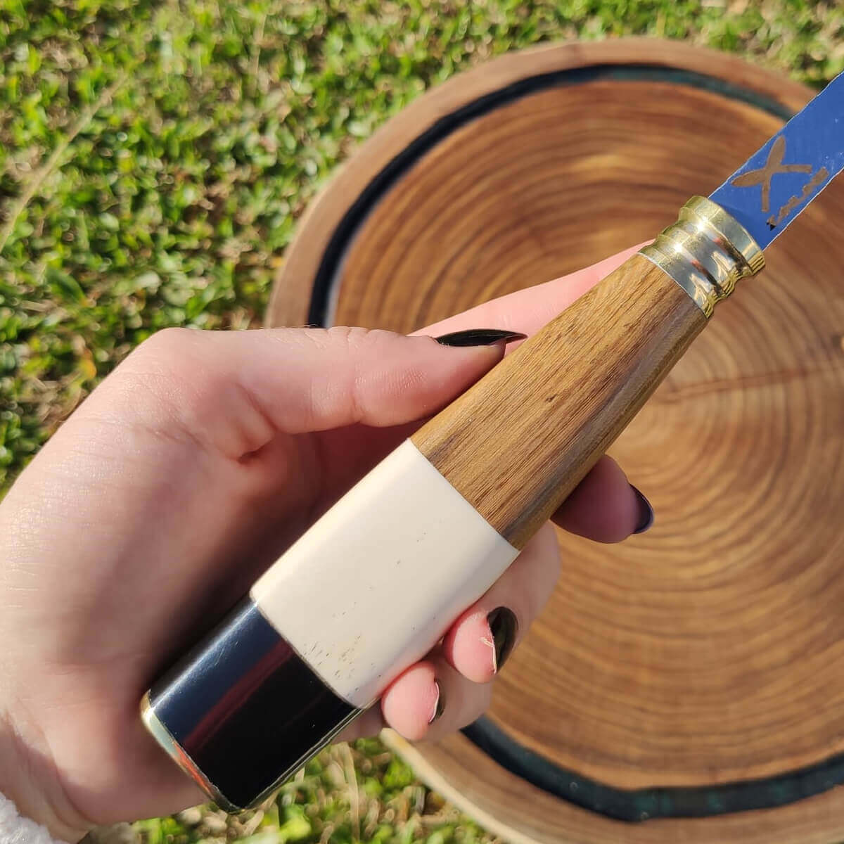 Materiais: aço inox 420C, madeira nobre, osso bovino, latão e resina.