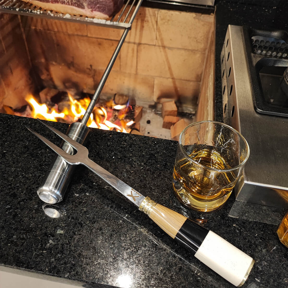 O garfo trinchante para churrasco da Zanline é um acessório indispensável para um bom churrasqueiro. O garfo grande de churrasco possui cabo fabricado em madeira nobre, osso bovino com detalhes em resina e guarda em latão. Conta ainda com lâmina produzida em aço inox 420C, peça resistente a ferrugem, de 8 polegadas e 3mm de dorso. Possui duas ponteiras bem afiadas que proporcionam maior precisão na hora de realizar o corte daquela deliciosa carne.