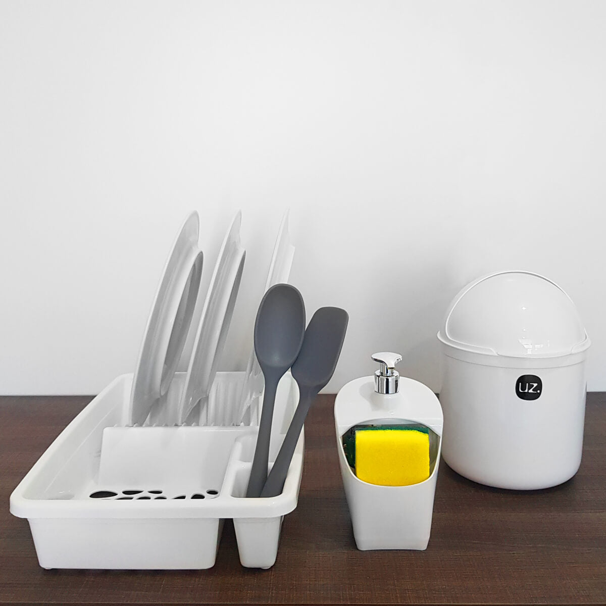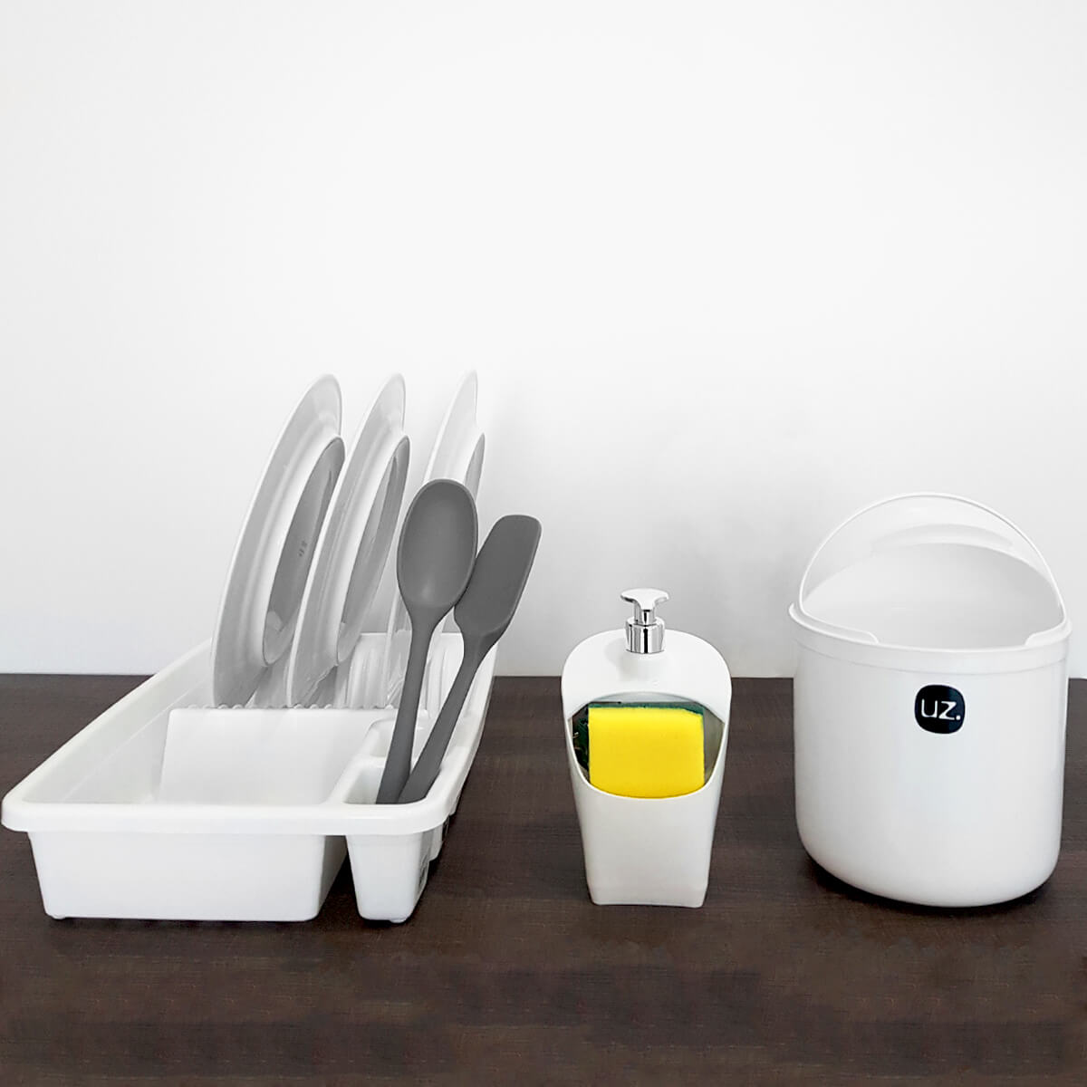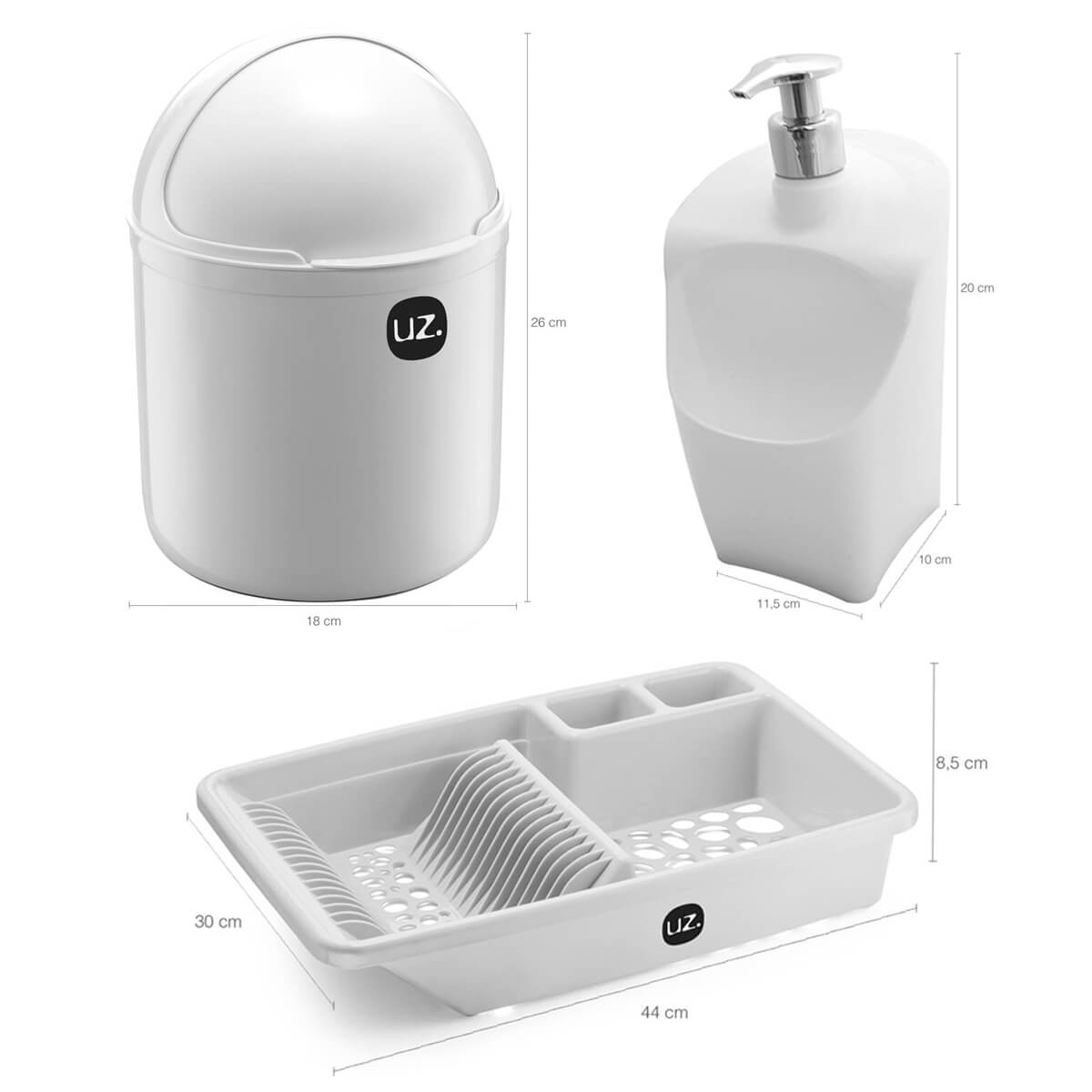 Pequenos cuidados com seu lar fazem toda a diferença.#Sua Cozinha Ainda Mais Completa e Requintada#Dispenser de Detergente e Porta Esponja#Escorredor de LouçasGarantia: 90 Dias / Peso: 890g / Cor: Branco / Ref: 180UZ3BRDimensões Escorredor De Louça: 44cm (C) x 30cm (L) x 8,5cm (A).Capacidade: 15 Pratos, Talheres, Panelas e outros utensílios.Dimensões Dispenser: 11,5cm (C) x 10cm (L) x 20cm (A).Capacidade: Esponja, 500ml de Sabão.Dimensões lixeira: 18cm (C) x 18cm (L) x 26,2cm (A).Capacidade da Lixeira: 4 LitrosCuidados: Não lavar com materiais abrasivos.Material:- Polipropileno: Material de alta resistência, apresenta uma superfície que dificulta o acúmulo de bactériasEste kit é essencial para a sua cozinha. O escorredor de louças, porta detergente e lixeira são indispensáveis no nosso dia a dia. Possuem material resistente e que não transfere odor, os organizadores de louças, permitem separar e organizar os talheres, pratos, copos e outros utensílios em cima da bancada, com base vazada para o escoamento da água. O dispenser para detergente comporta o produto de limpeza e esponja, deixando a pia organizada. E a lixeira tampa capacete 4 litros por ser compacta proporciona praticidade.SKU: UZ335BRE350BRE367BR