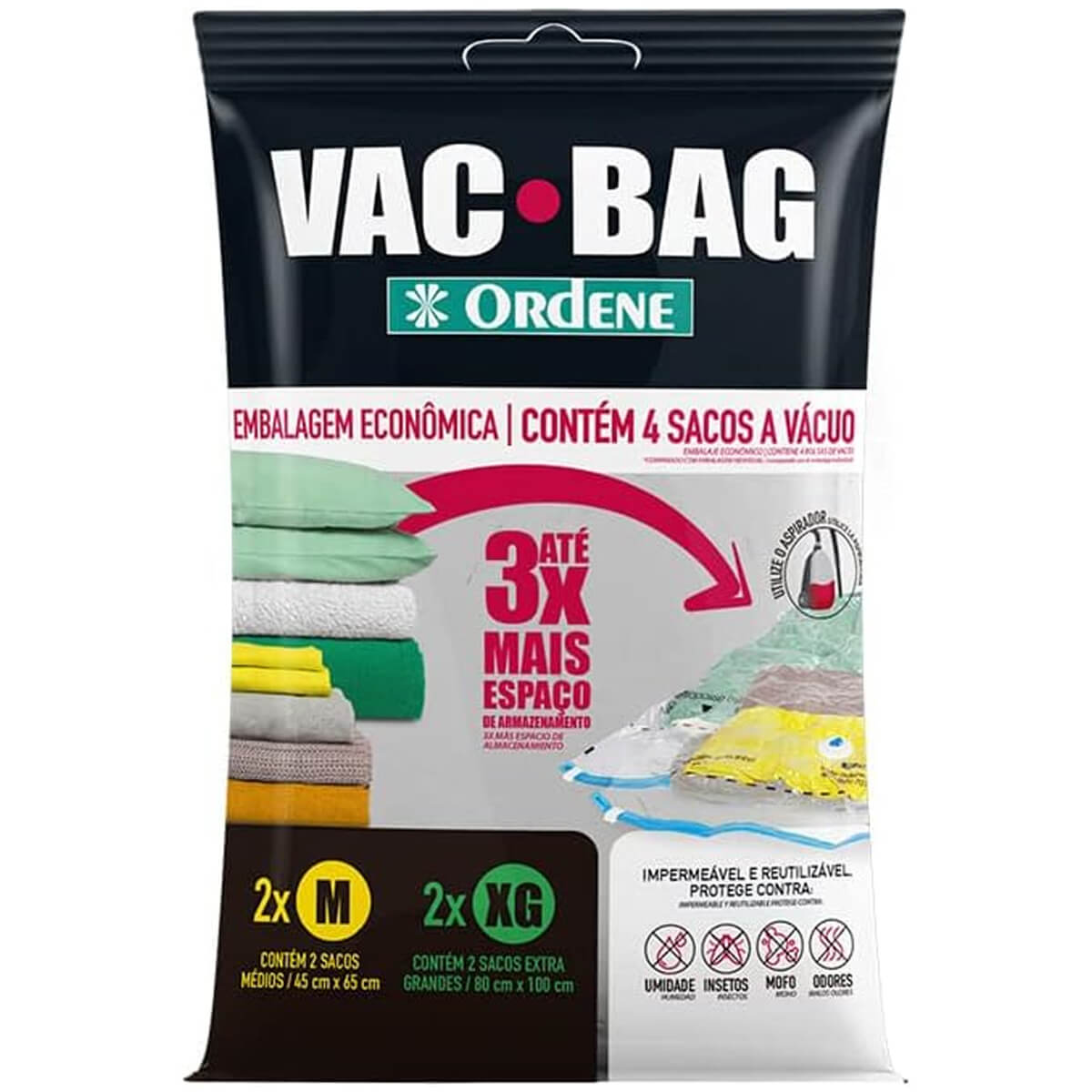 | Local de Uso Indicado | Ideal para armazenar a vácuo roupas, travesseiros, cobertas e edredons, podendo triplicar o espaço no seu roupeiro |