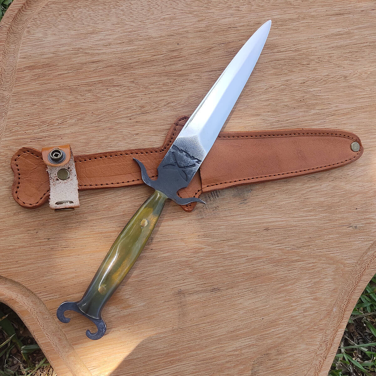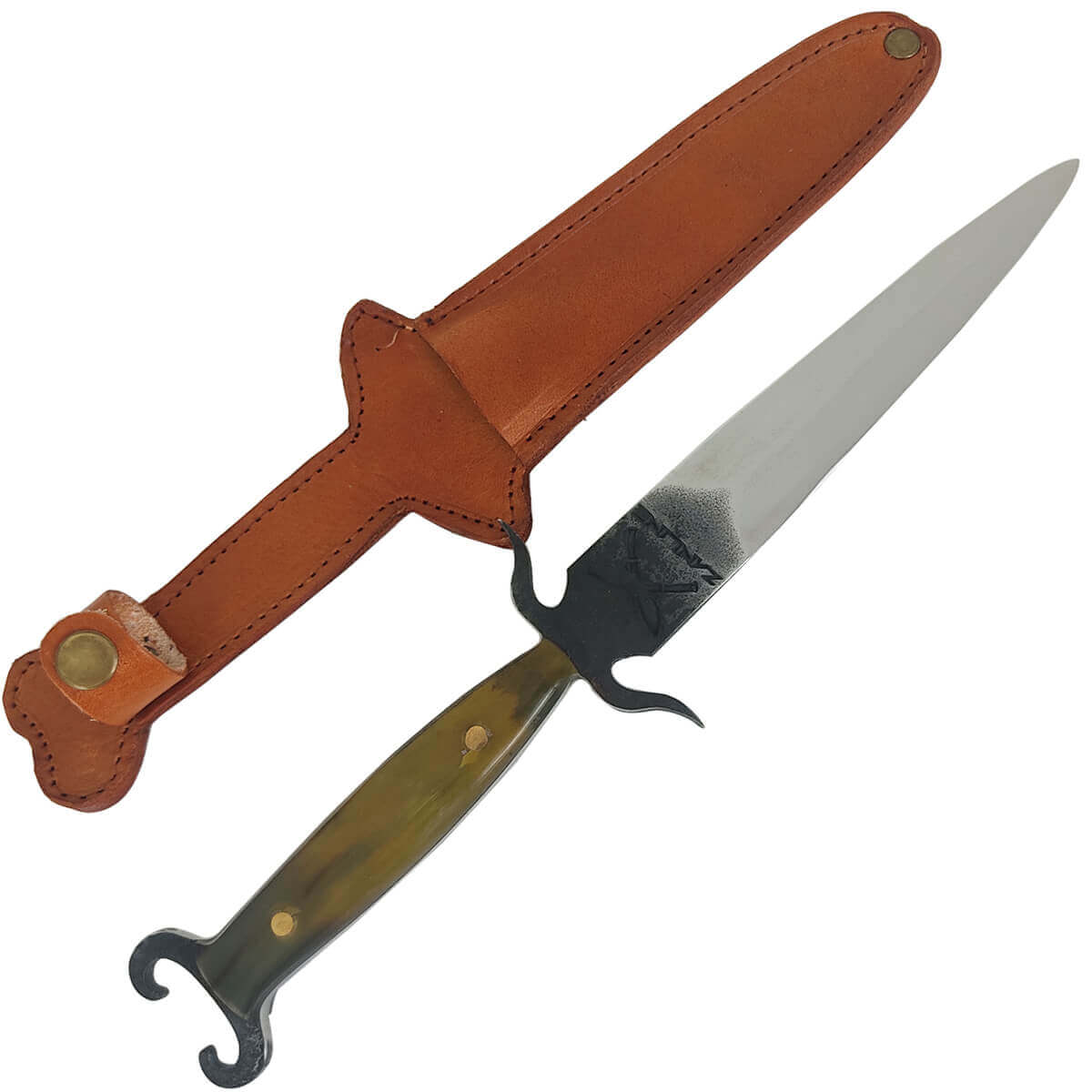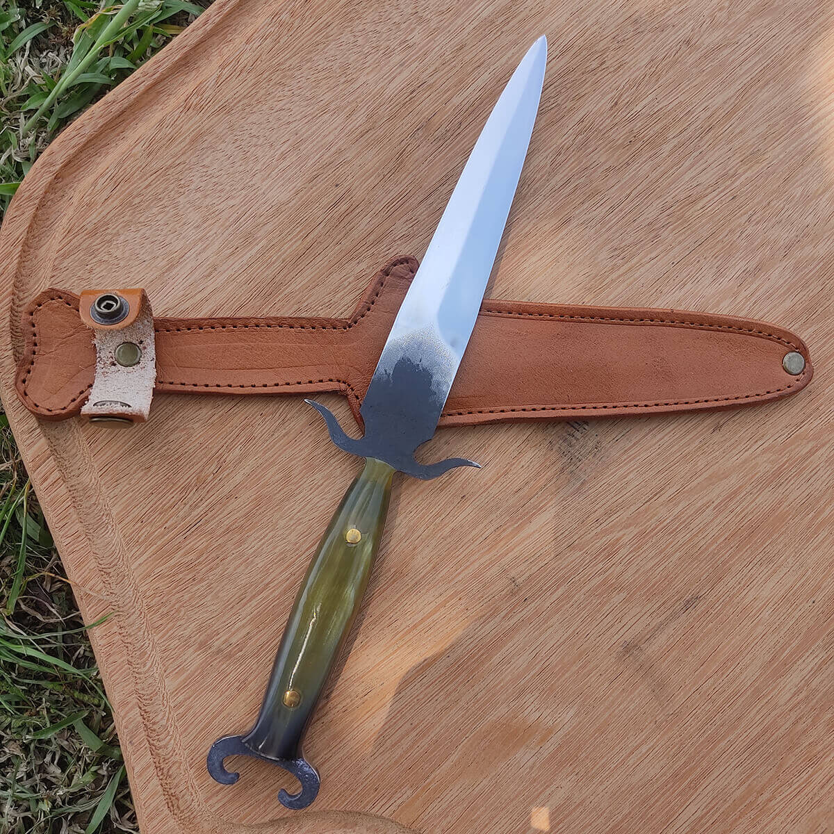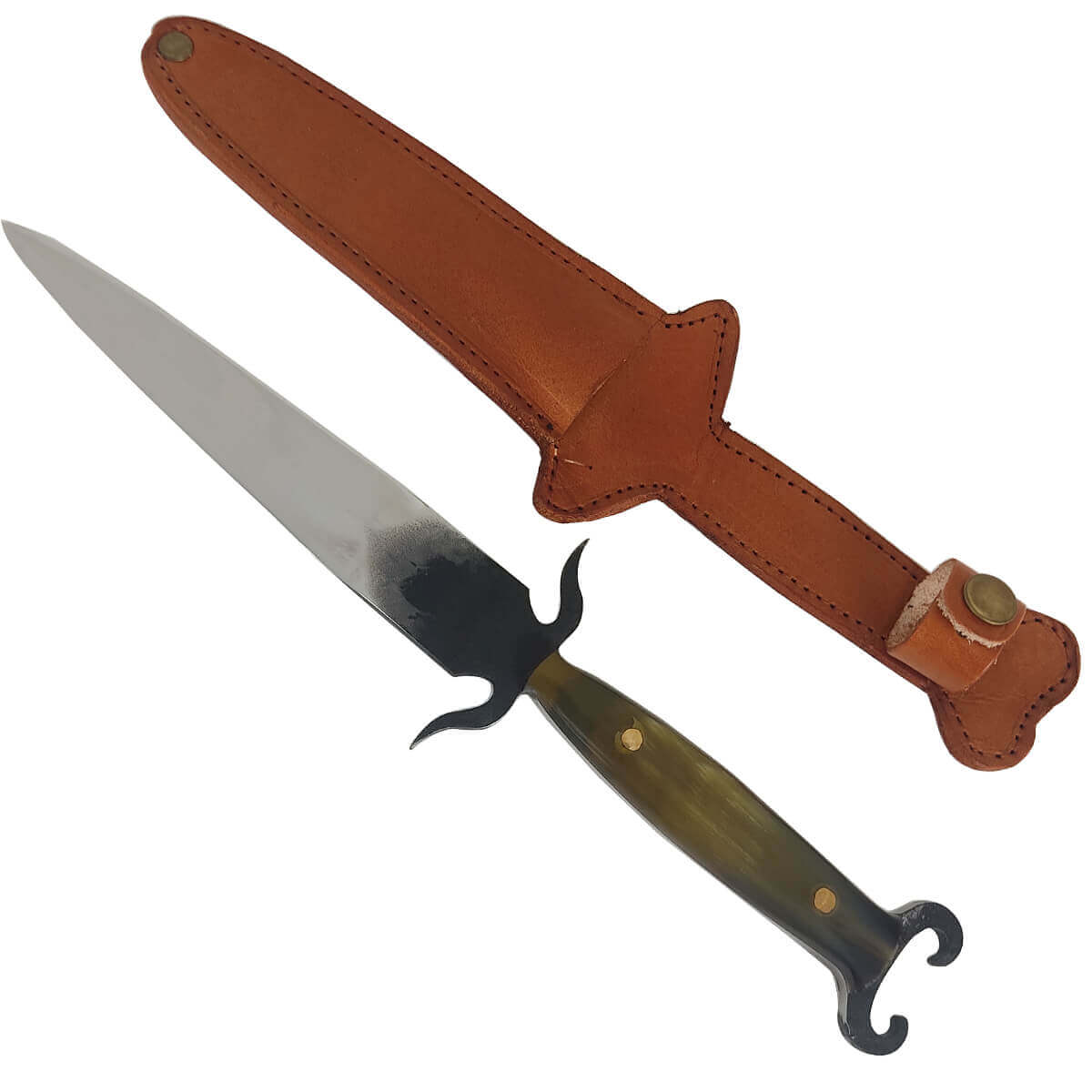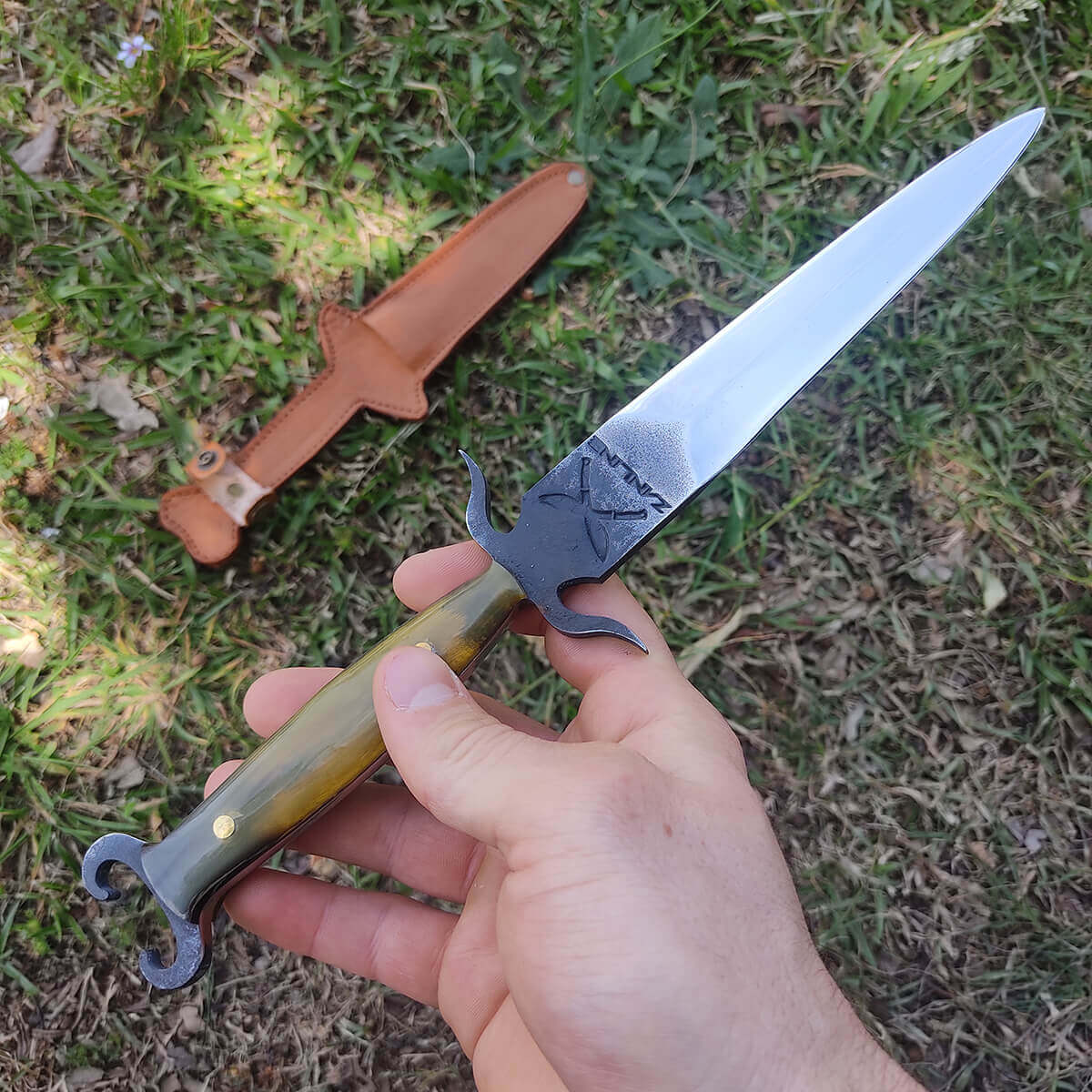 Punhal artesanal para caça produzido artesanalmente em aço inox 420c de 5 polegadas, com lâmina de dois gumes (possui fio em ambos lados da lâmina), com excelente corte e grande retenção de fio. A adaga pequena é full tang, ou seja, tem lâmina que se entende inteiramente até o final do cabo, tornando a peça muito resistente e garantindo firmeza na utilização. Cabo feito em chifre, material nobre e raro, sendo cada punhal único e exclusivo, com tonalidades e manchas que não se repetem em nenhuma peça.